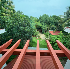 130 Seaside Villa is a stunning modern–retro fusion beach house set on an expansive 12,000 sq. ft. plot in a posh residential neighborhood. Surrounded by lush greenery and landscaped gardens, the home welcomes you with a serene koi pond at the entrance.